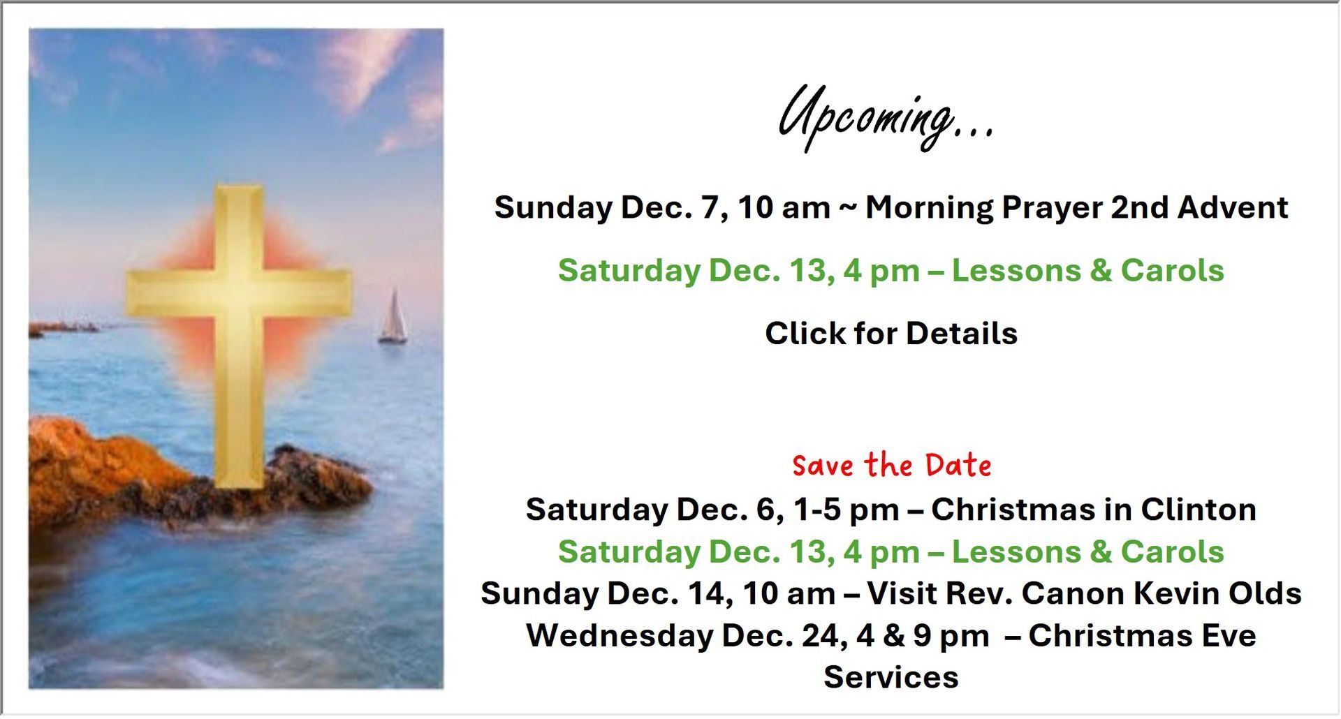 Holy Eucharist on the 2nd, 4th and 5th Sundays of each month and Morning Prayer on the 1st and 3rd Sundays of the month.