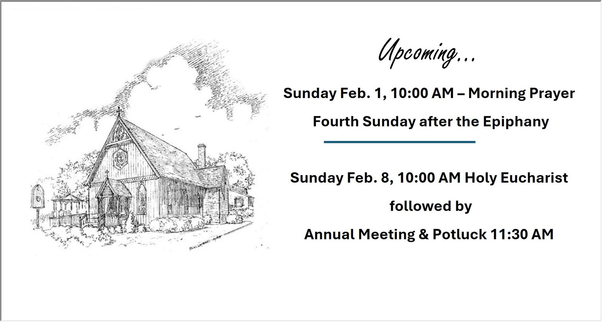 Holy Eucharist on the 2nd, 4th and 5th Sundays of each month and Morning Prayer on the 1st and 3rd Sundays of the month.