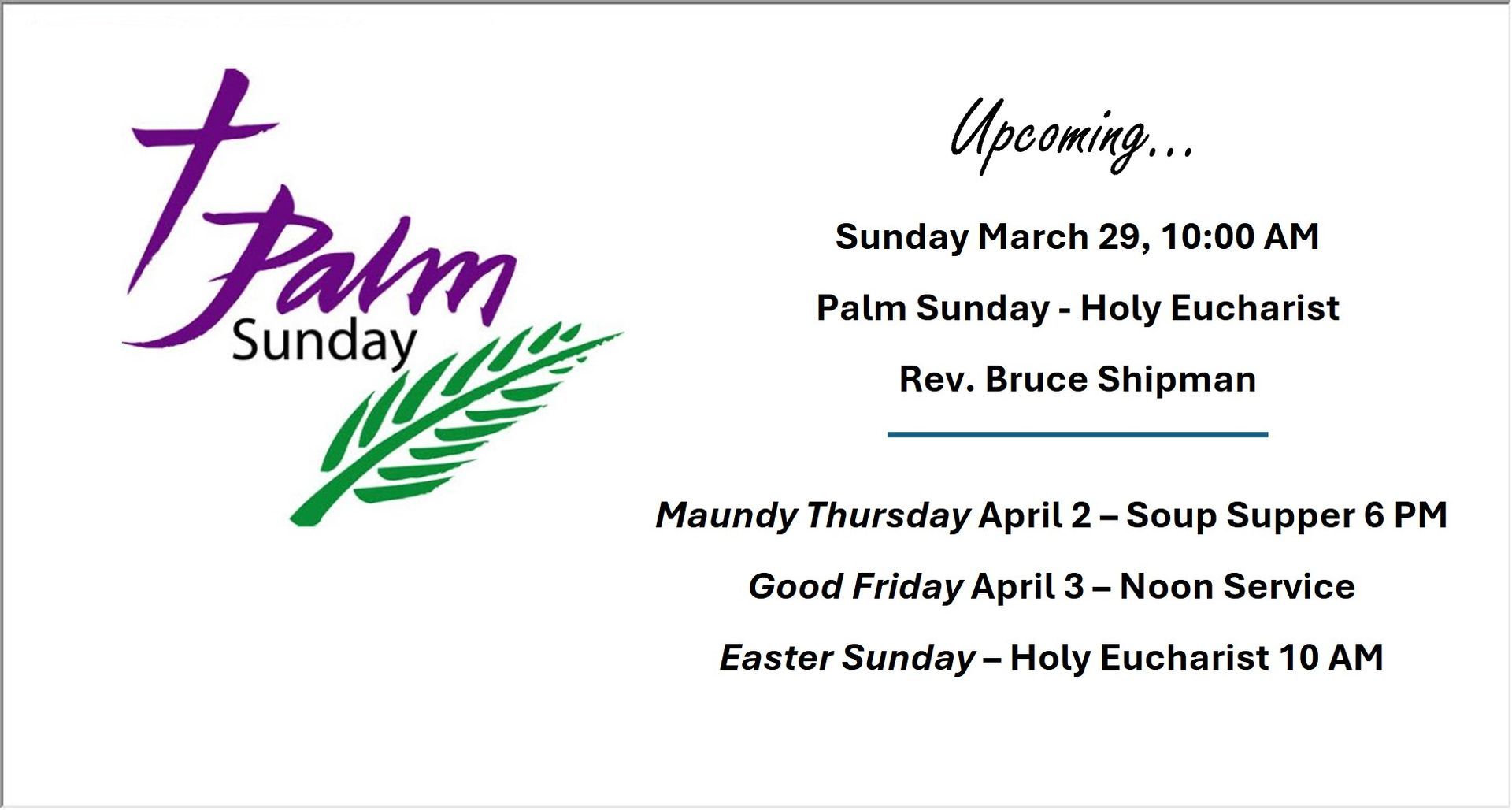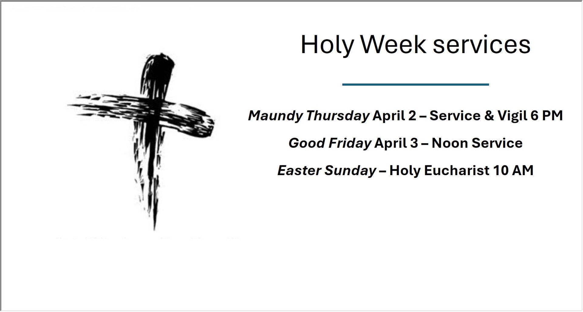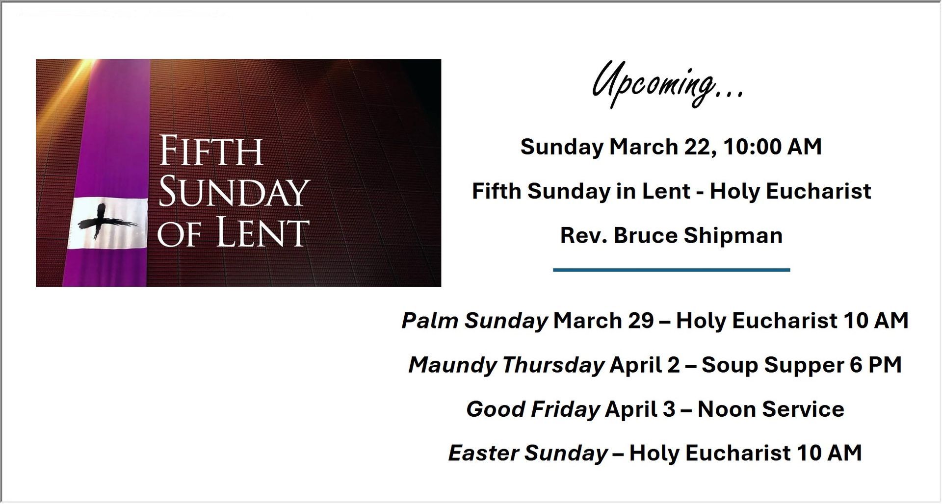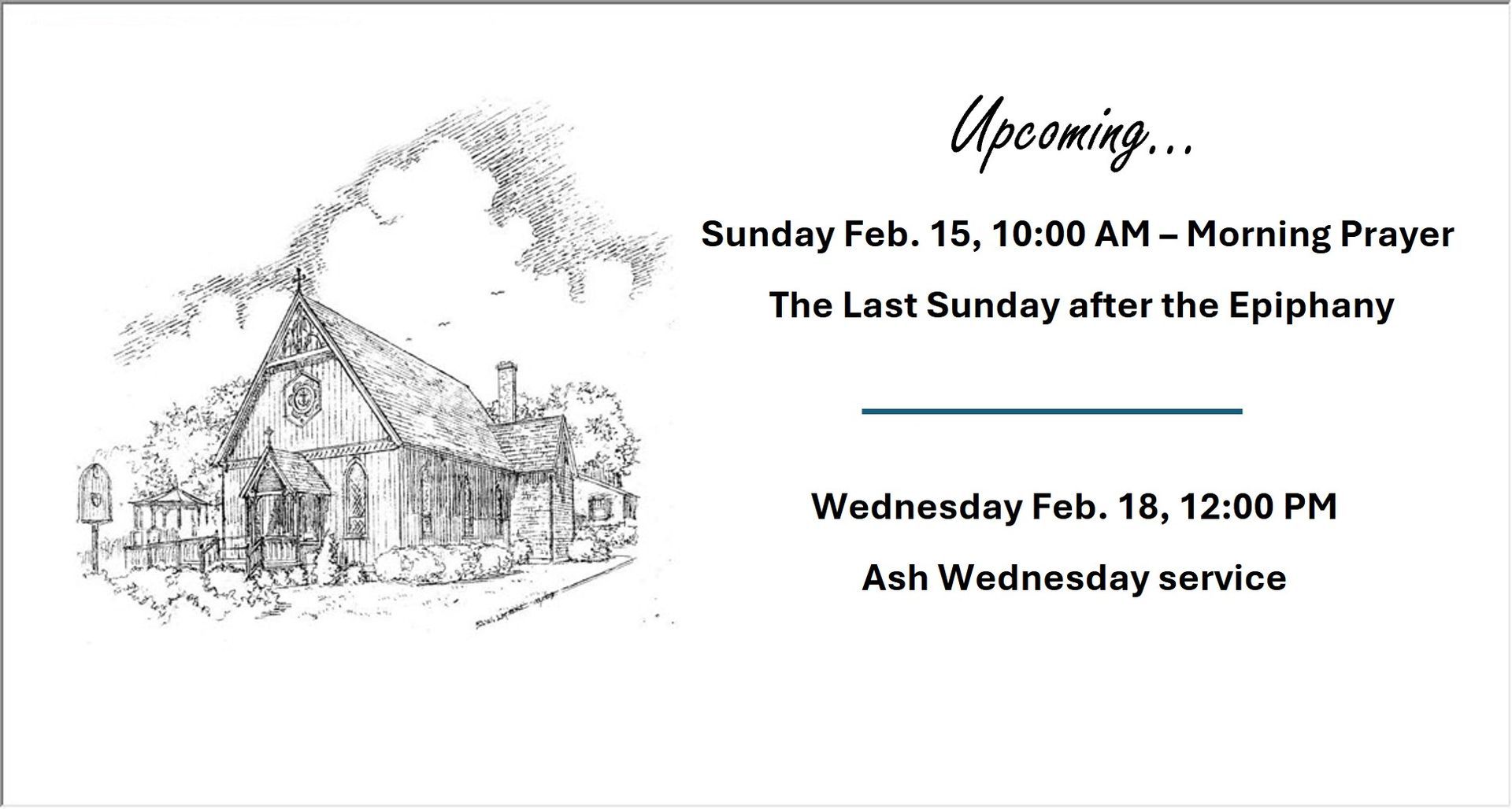 Holy Eucharist on the 2nd, 4th and 5th Sundays of each month and Morning Prayer on the 1st and 3rd Sundays of the month.